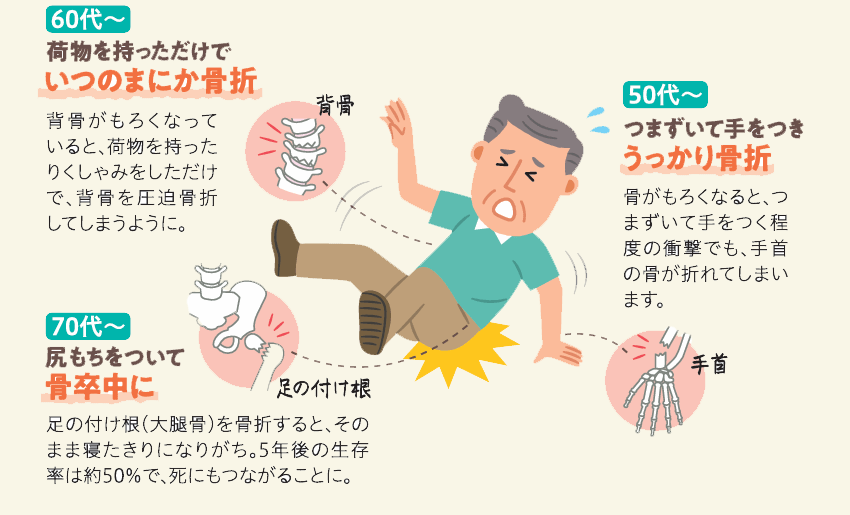 また、骨粗しょう症による骨折は、1カ所骨折をしてしまうとドミノ倒しのように骨折が相次ぐ「ドミノ骨折」の危険性も伴うため、骨力アップが必要不可欠です。