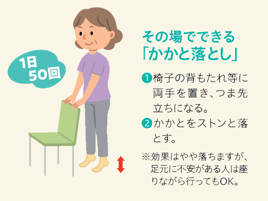 代表的なものは、ウォーキングですが、立位からつま先立ちをして、かかとをストンと落とす「かかと落とし」なども効果的です。