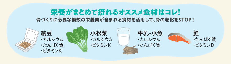 骨に重要な栄養素でありながら体内に吸収されにくいため、ビタミンDやビタミンKと一緒に摂取を。