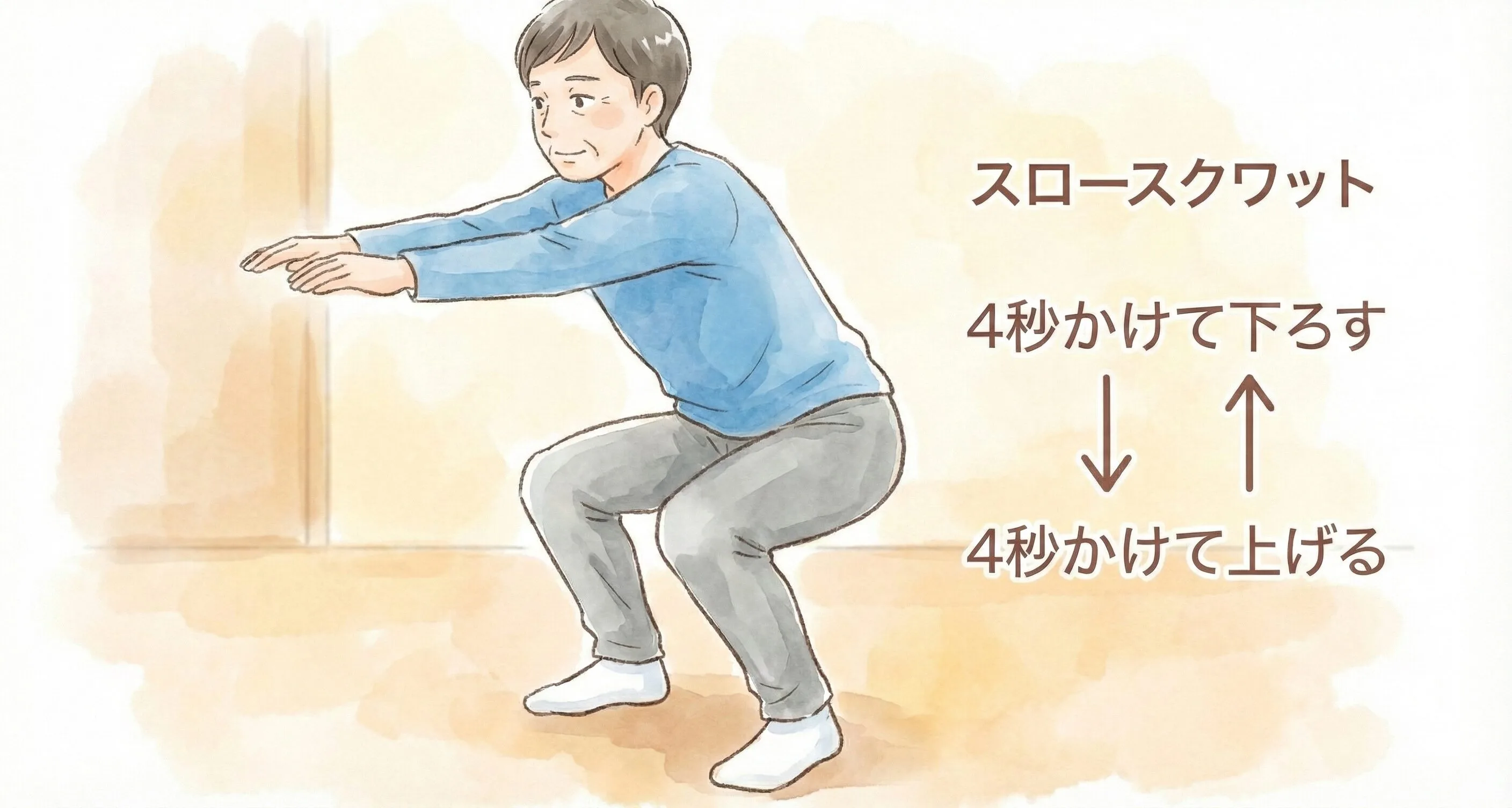 足を肩幅に開いて立ち、4秒かけてゆっくり腰を落とし、4秒かけてゆっくり立ち上がる動作を繰り返します。