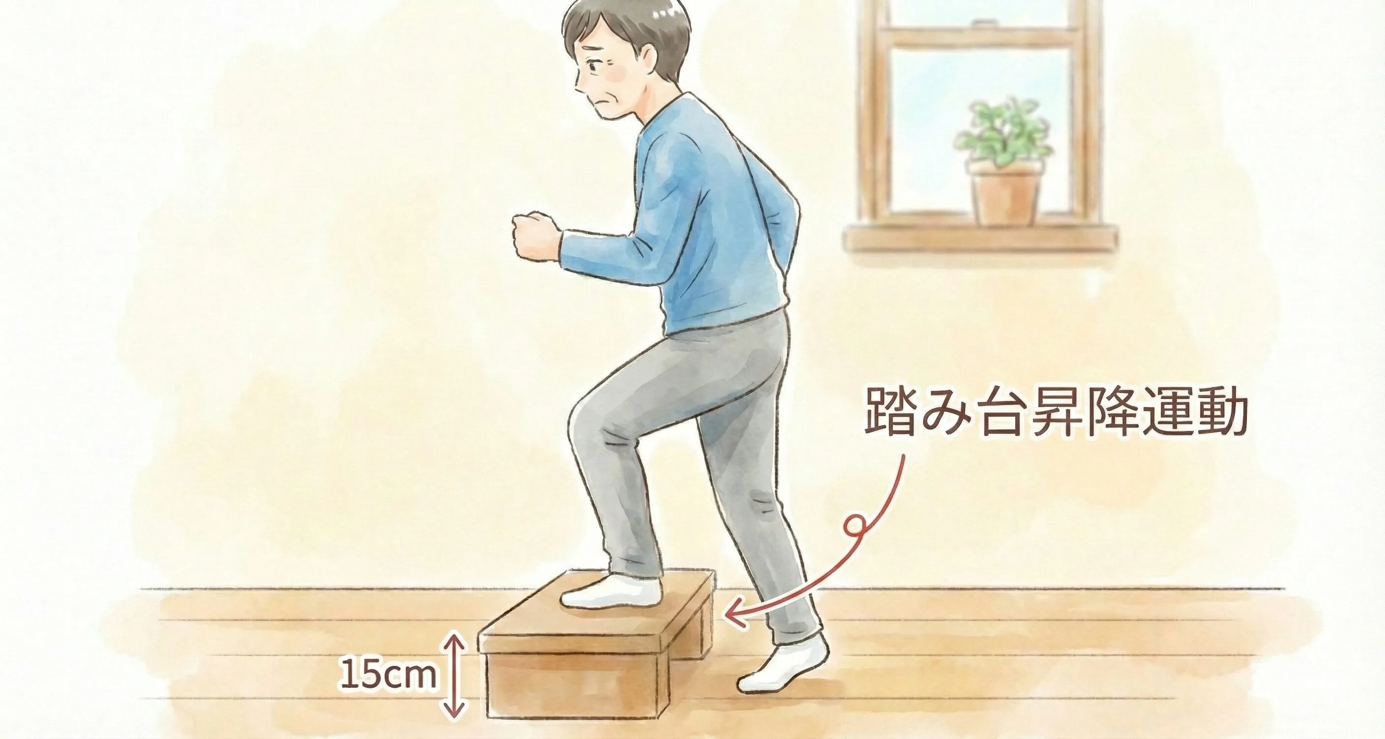 台に片足を乗せて体を持ち上げ、両足で台の上に立ったら、同じ足から降りる動作を左右交互に繰り返します。