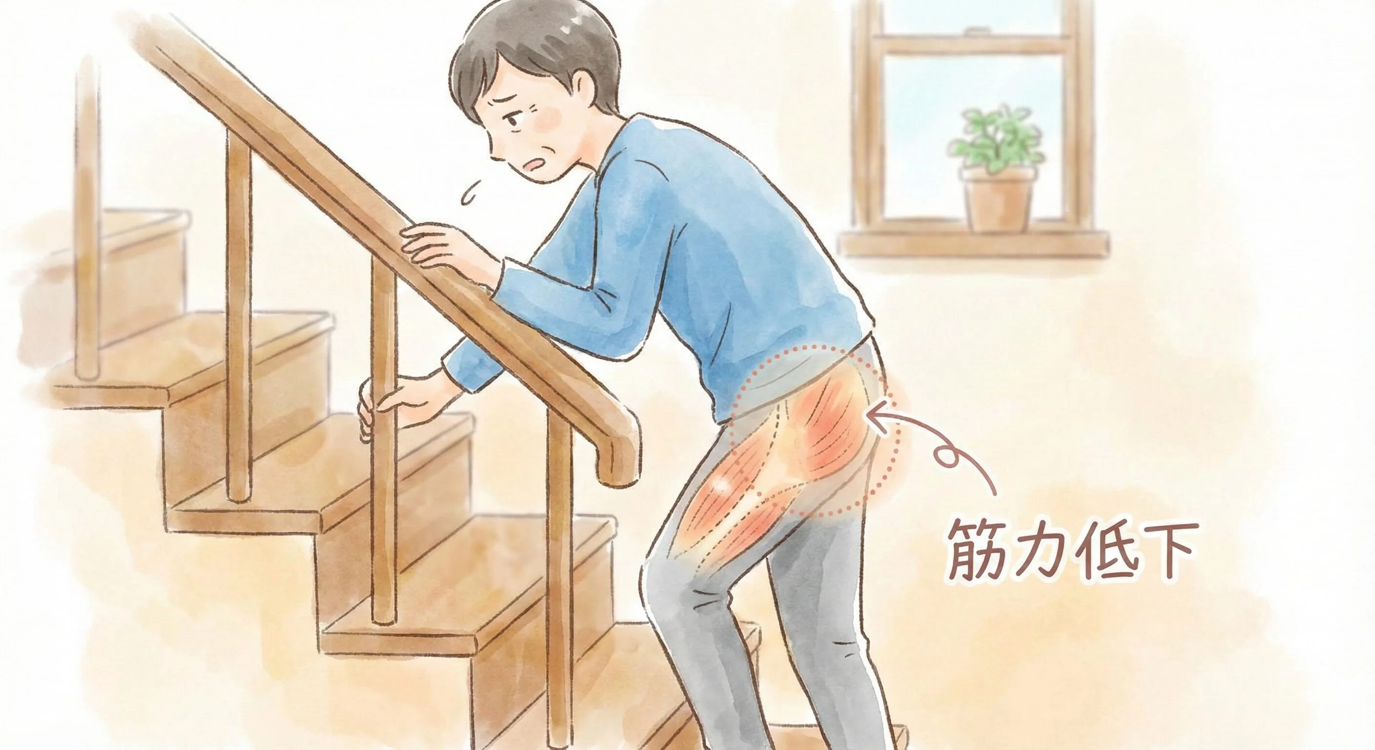 「以前より階段で足が重く感じる」「一段上がるたびに太ももがだるくなる」といった症状は、筋力低下のサインかもしれません。