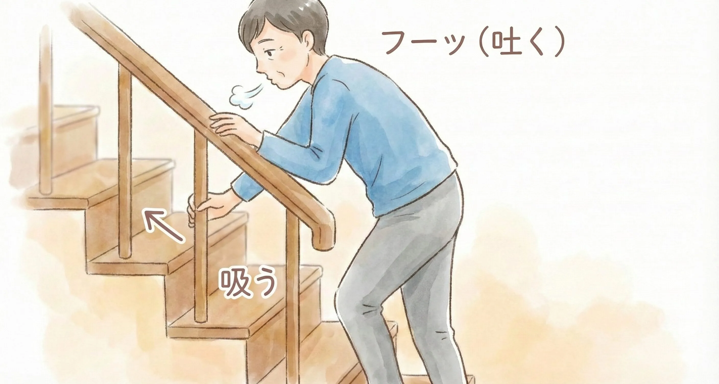 一段上がるごとに「フーッ」と息を吐き、次の一段で自然に息を吸うというリズムを作ってみてください。