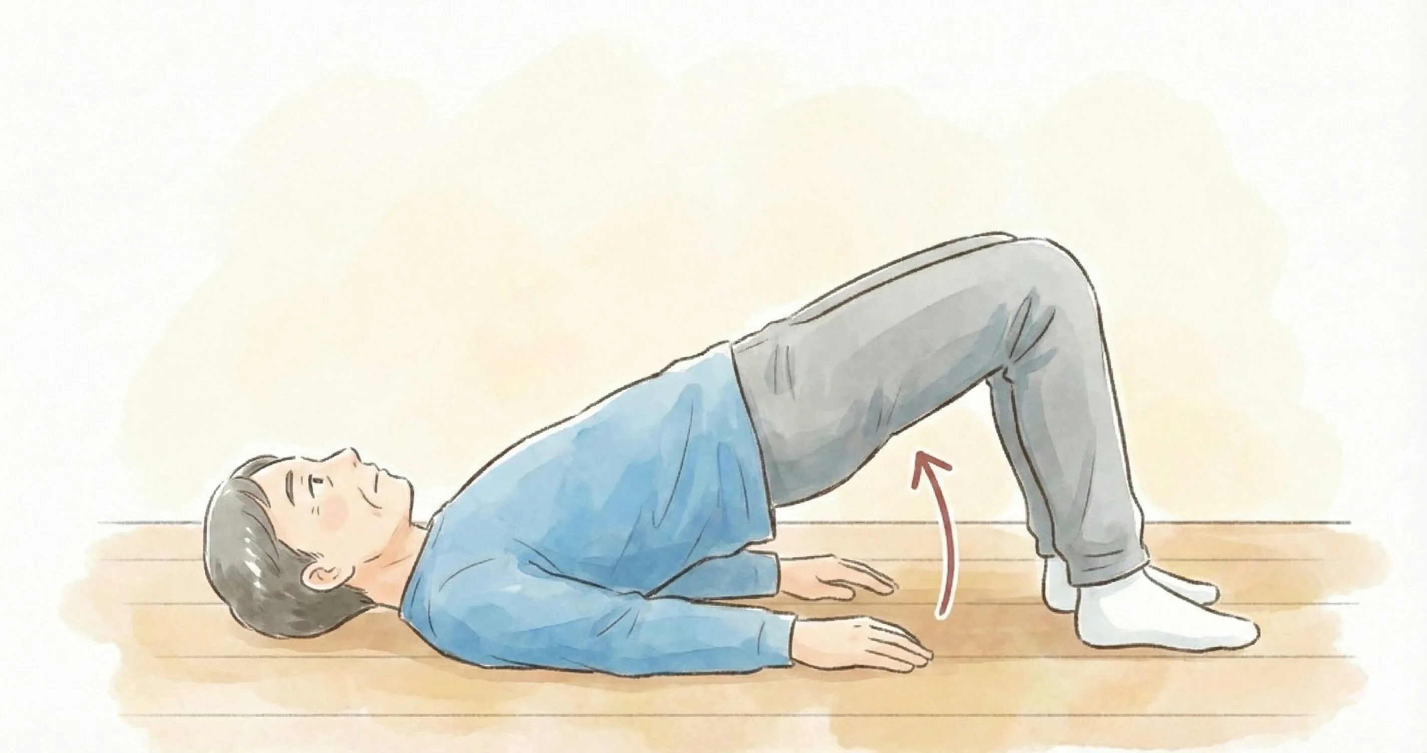 仰向けに寝て膝を立て、足を肩幅程度に開いた状態からお尻をゆっくり持ち上げ、肩から膝が一直線になる位置で2〜3秒キープします。