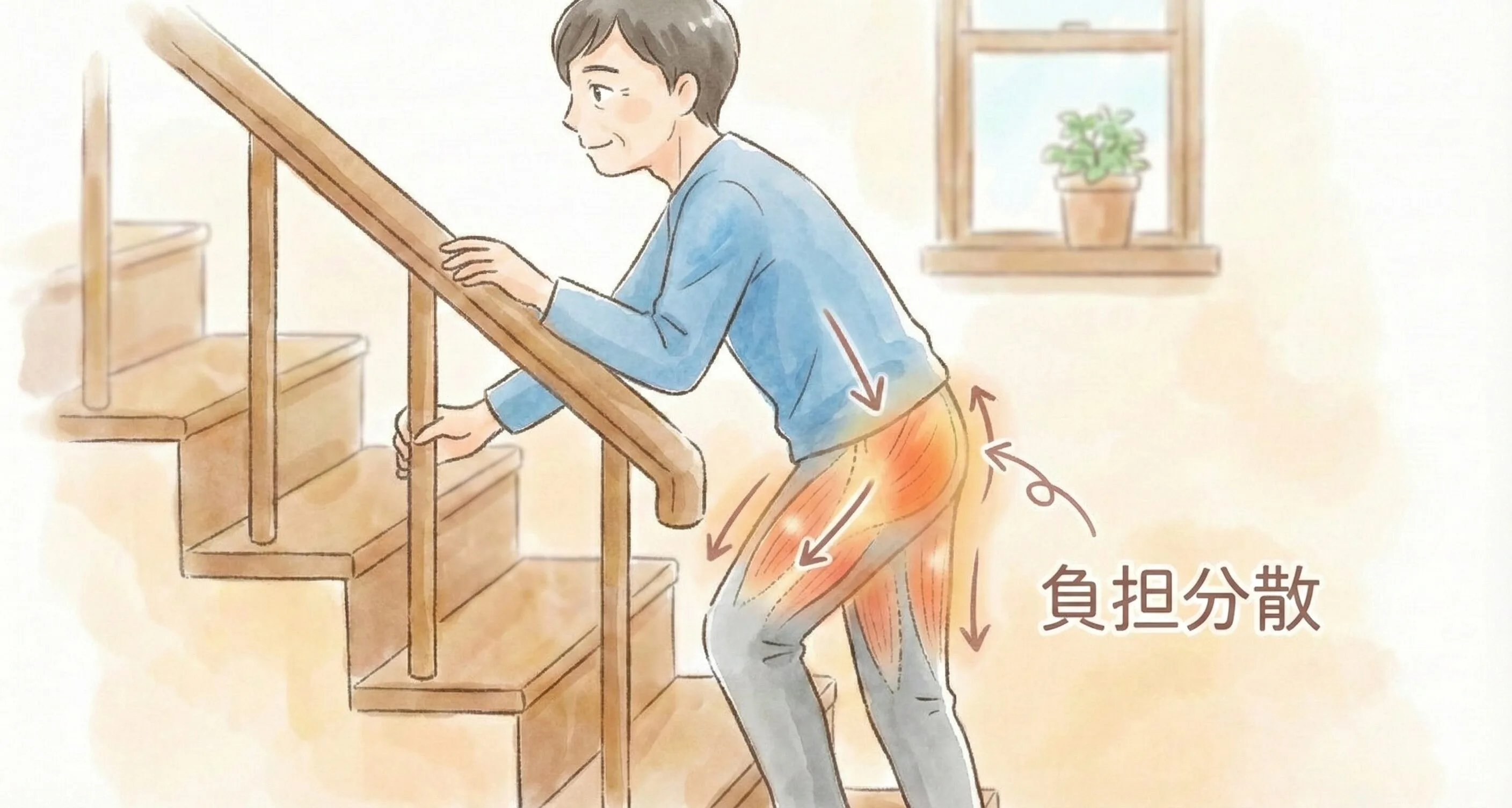 手すりにつかまることで体を支える力が分散され、足腰だけに頼らずに階段を上り下りできるためです。
