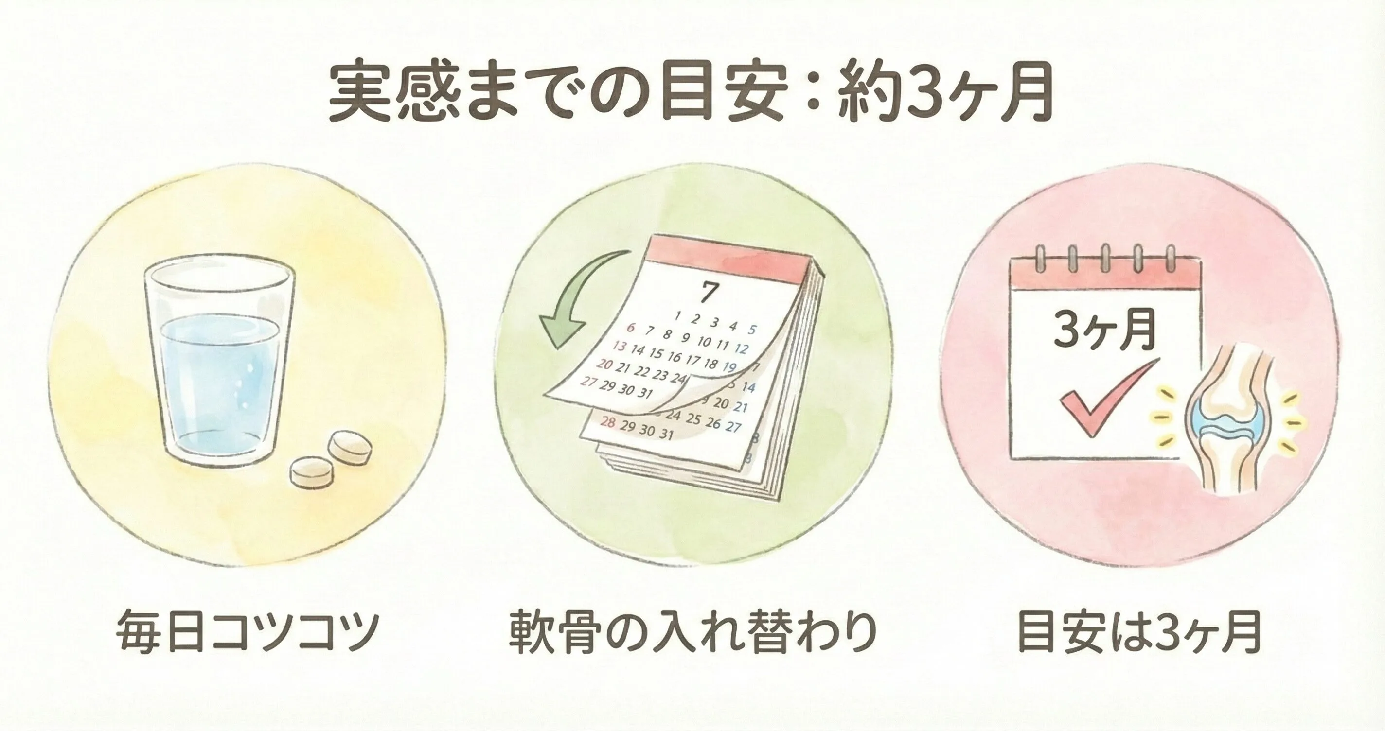 サプリメントは3ヶ月程度を目安に継続することで、実感しやすくなるといわれています。